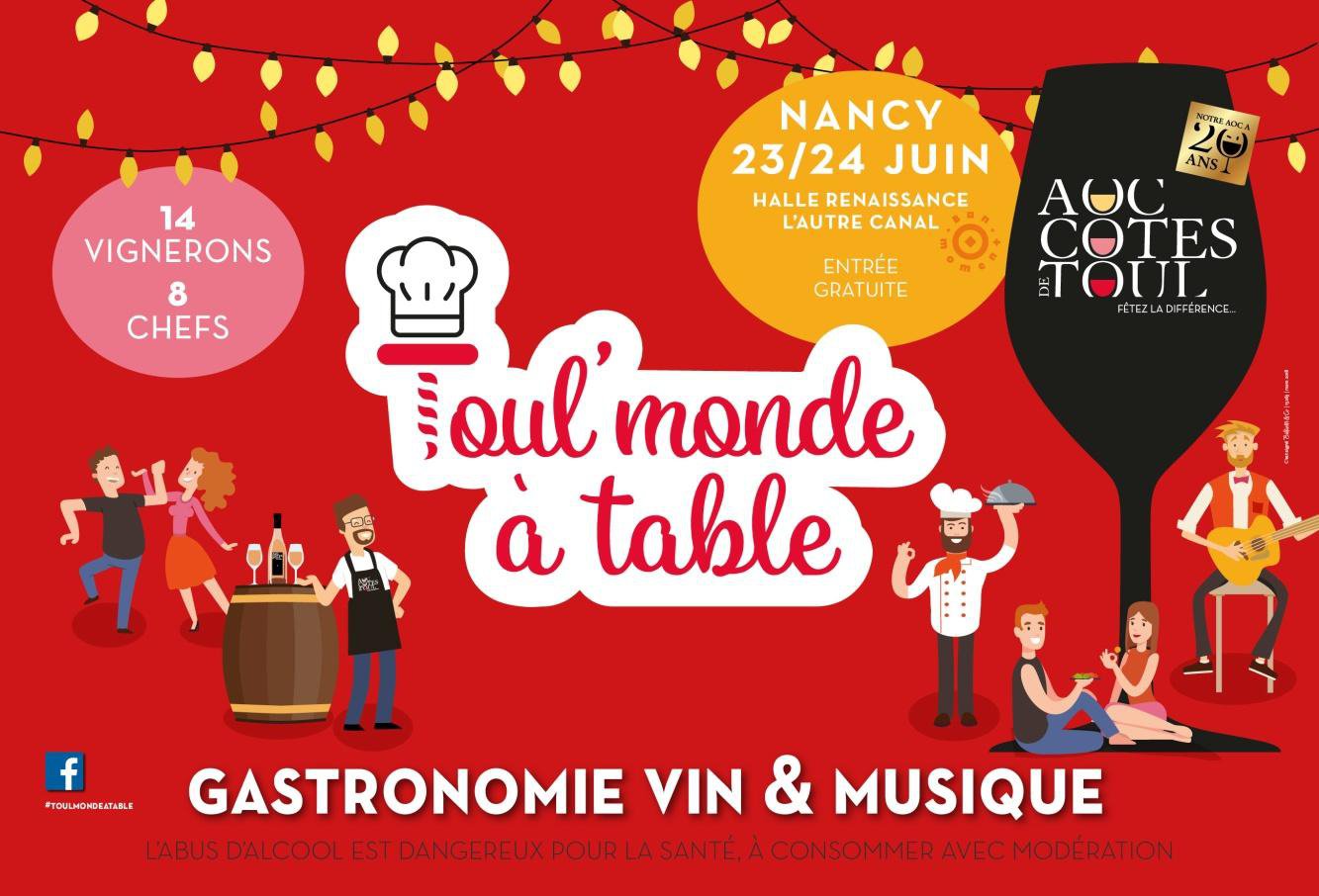 Bien manger, (re)découvrir les vins du terroir Lorrain et prendre du bon temps dans un espace dédié à l'art de vivre, tel est l'esprit de cet événement inédit, convivial et fédérateur ! Vin, gastronomie et musique seront les ingrédients incontournables de « Toul'Monde à Table » pour une fête réussie ! « Toul'Monde à Table », c'est …